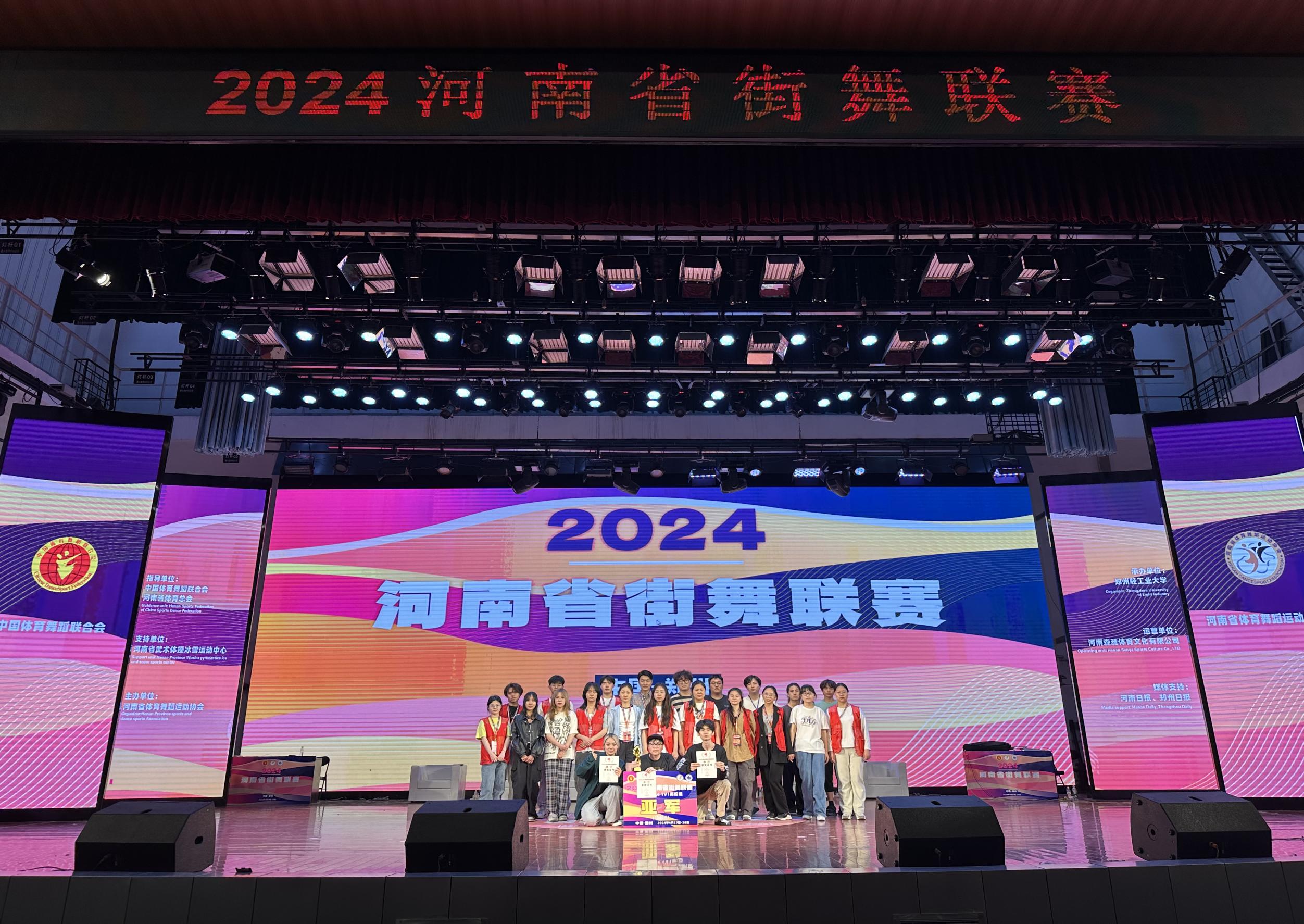 4月27、28日,由中国体育舞蹈联合会、河南省体育总会指导,河南省体育舞蹈运动协会主办,开云APP官网下载和官网链接 承办的2024河南省街舞联赛在开云APP官网下载和官网链接 (东风校区)大礼堂隆重举行。来自全省的300余街舞选手参加了本次大赛,经过激烈的角逐,我校选手荣获高校组比赛亚军和第四名的好成绩。