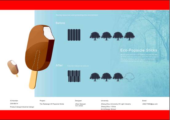 《Eco Popsicle Sticks》作品介绍:该设计针对人们日常消费的冰棒棍进行了新的思考,即在不影响已有的人机关系的基础上(人们手持冰棒棍的习惯和舒适性),通过对一整块木料上的重新分割来增加材料的使用数量,从而减少人们对于自然环境的压力。