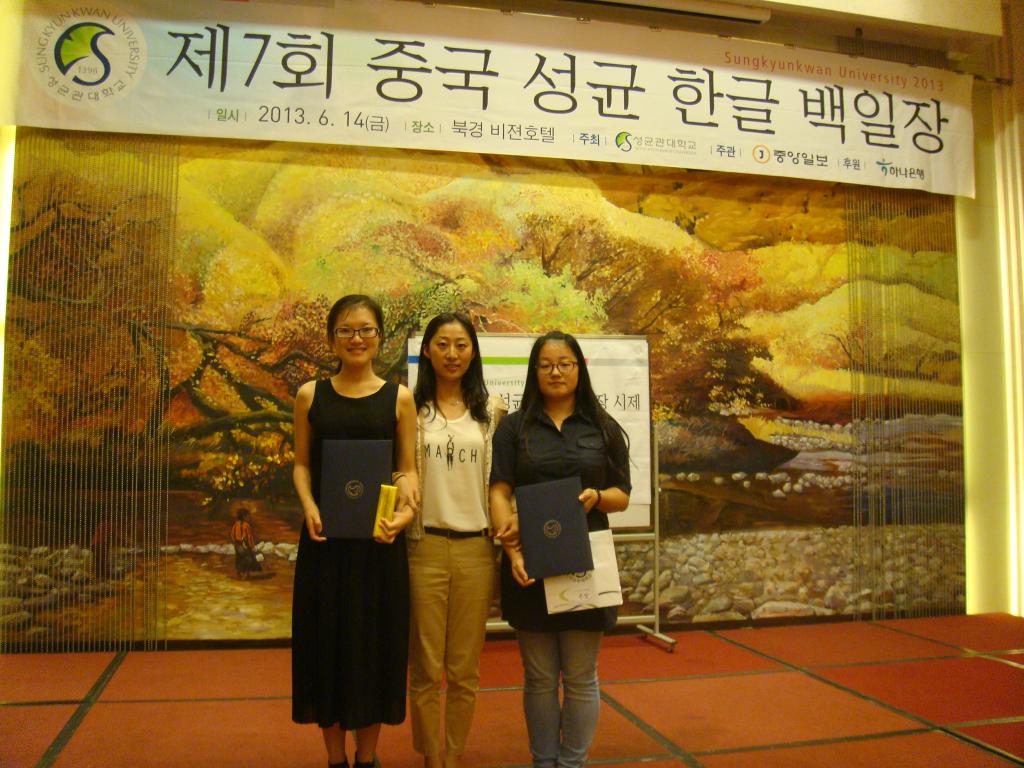 此次大赛,是以非朝鲜族的中国大学生为主要参赛对象。共设一、二、三等奖各1名,佳作奖和奖励奖15名。前三名得主可获得就读韩国成均馆大学硕士学位的全额奖学金和三星数码相机一部。我校徐珊珊博士带领两名朝鲜语学生参加了该次比赛。在两个半小时内,参赛学生按照规定主题进行散文题材、不限字数的写作。经过激烈角逐,我校参赛的两名朝鲜语学生,石丽莎同学以文笔流畅、主题鲜明、感情丰富,获得二等奖;寇誉元同学获得佳作奖。