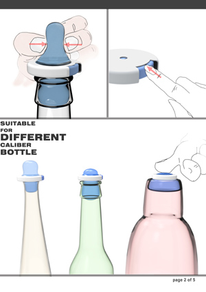 作品介绍:该设计作品创新了人们对于瓶盖、瓶塞的使用体验和趣味性,通过一键开关的阀门使得气囊塞一侧的空气能够被挤压至另一侧形成膨胀空间,从而对瓶子进行密闭,在需要打开瓶塞的时候也能通过简单操作完成。