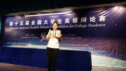 近日,2014年全国大学生英语竞赛全国总决赛暨2014年全国大学生英语夏令营在沈阳东北大学举办。夏令营期间举办了第十五届全国大学生英语演讲比赛、第十五届全国大学生英语辩论赛、第八届全国大学生英语风采大赛。我校电气信息工程学院学生孙梓晋和艺术设计学院学生张冉参加了上述三项比赛。经过激烈的角逐,张冉荣获演讲比赛二等奖,风采大赛二等奖;孙梓晋荣获演讲比赛三等奖;张冉、孙梓晋、楚晓然(河南科技大学)代表河南队获辩论赛一等奖。这是我校近年来首次进入该项竞赛全国总决赛并获奖。河南省共有14个院校17名学生进入总决赛,8名学生参赛,我校参赛队成绩最好。