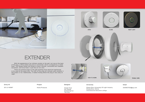 获奖作品 《EXTENDER内嵌式多功能插座》 以改变现有的插线板电线的局限性为设计意向,将插座头设计为可伸缩性插座,加上插座周围所设计的插座板,并搭配容易弯曲固定的电线,不仅满足了固定在墙面上的插座使用,又满足了插线板的用线不够,充分的解决了家庭插座不够,且运用插线板地面电线过多的情况。此次传媒艺术设计学生获得IF设计大奖也再次证明了设计的贯穿性,为传媒艺术设计与工业设计架起了一座桥梁。
