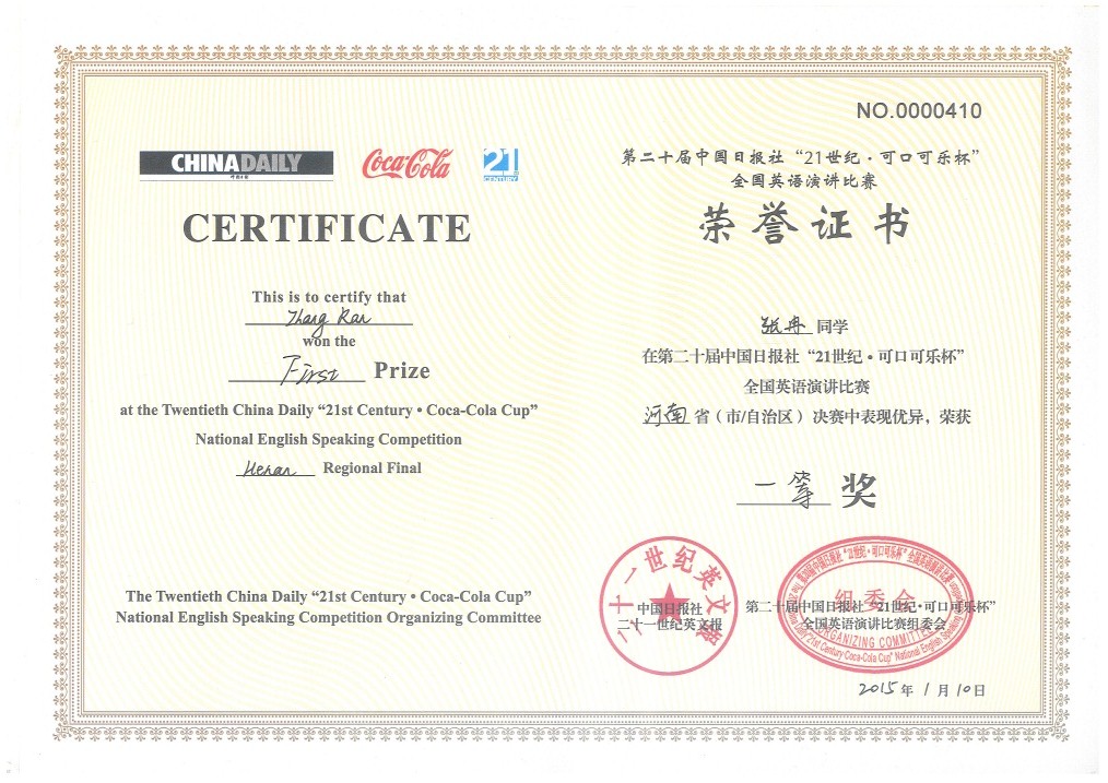 近日,第二十届中国日报社“21世纪•可口可乐杯”全国英语演讲比赛河南赛区决赛在河南师范大学新联学院落下帷幕。经过激烈角逐,我校艺术设计学院张冉同学获得一等奖(总排名第五名)的优异成绩,刷新了我校参加省级英语演讲比赛的最好成绩。