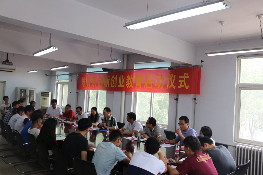 为增强学生创业观念,激发学生创业热情,丰富学生创业知识,培养学生创业能力, 6月18日上午9点体育系在系三楼会议室举办了学生创新创业教育启动仪式。教务处张东初处长、体育系郗冰杰书记、范广军副书记、方慧副主任、部分学生创业指导教师、体育系2012级全体学生参加了启动仪式。