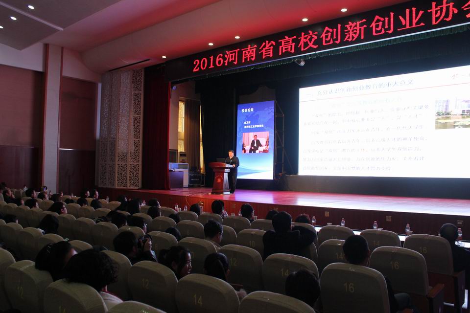 11月12日,2016河南省高校创新创业协会年会暨创新引领高校发展高峰论坛在南阳理工学院隆重召开。作为协会发起单位之一,我校赵卫东校长应邀出席了大会并做了专题演讲。中国工程院院士刘人怀、教育部高等学校创业教育指导委员会副主任李家华、河南省教育厅就业创业中心副主任焦金雷,以及来自中国高校创新创业教育联盟、省内外数十所高校和企业的领导专家及会员单位代表近400人参加了会议,我校教务处、就业指导中心、校团委、工程训练中心等部门负责人也参加了会议。