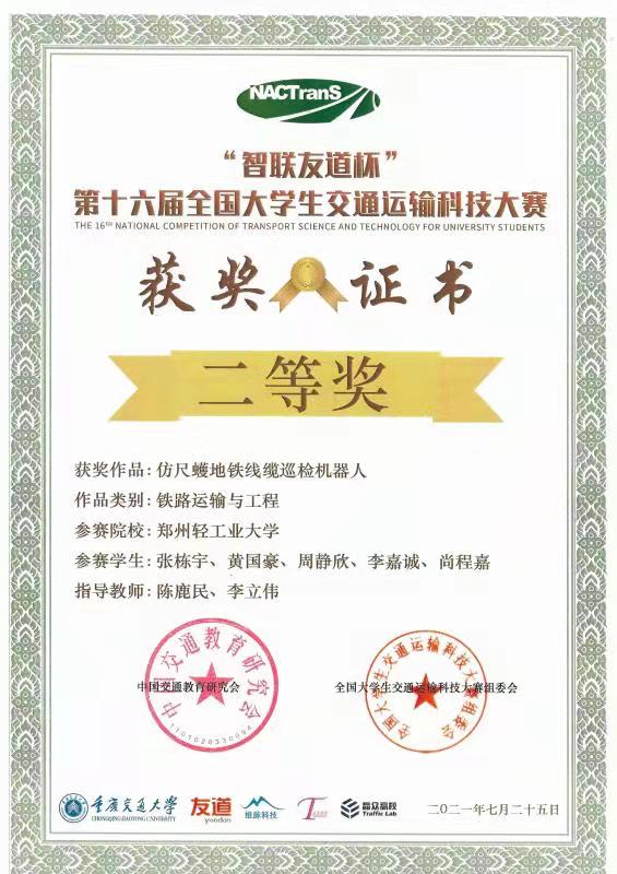 1 | 铁路运输与工程 | 张栋宇 | 测控19-01 | 541902030127 | 陈鹿民 | 二等奖 |
