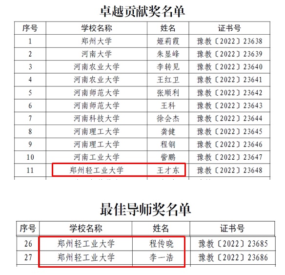 我校获“河南省大学生创新创业训练计划最佳组织奖”(全省20所)。王才东教授获“河南省大学生创新创业训练计划卓越贡献奖”(全省22人)。程传晓和李一浩老师获“河南省大学生创新创业训练计划最佳导师奖”(全省50人)。