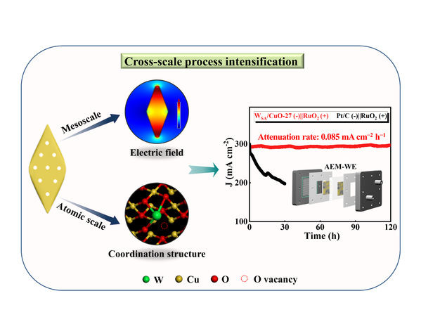 发展高效的非贵金属电解水催化剂对于实现绿色能源再生和社会可持续发展至关重要。单原子催化剂因其丰富的活性位点、超高的原子利用效率等优点有望替代传统的贵金属催化剂,然而目前仍然存在活性低和稳定性差的难题。过程强化工程涉及空间限域、流体传质、中间体富集等物理过程以及反应物吸附、反应、脱附等化学过程的协同优化,对提升多步催化反应的热/动力学至关重要。基于此,团队可控合成了具有曲率可调的纺锤形CuO载体,优化了纳米尖端的介尺度局域电场,调控了W单原子周围的局域原子结构,实现了催化剂的跨尺度过程强化,大幅提升了电解水制氢的催化活性和稳定性。高曲率载体赋予催化剂显著增强的局域电场和更高的局域配位数,合成的材料在阴离子交换膜电解槽中表现出可与商业催化剂相媲美的活性和更优的稳定性(衰减率仅为:0.085 mA cm2 h1)。
