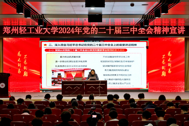 校团委副书记翟一晓紧扣学习贯彻党的二十届三中全会精神主题,从党的二十届三中全会召开的基本情况、精神要点、重大成果等方面,结合学校实际、青年工作实际进行了党的二十届三中全会精神宣讲,引导全体青年学生深刻领悟党的二十届三中全会精神的新思想、新观点、新做法,鼓励大家争当党的二十届三中全会精神的坚定信仰者、有力传播者、忠实践行者,在学懂弄通做实上走在前,在履职尽责担当上作表率,以实际行动助推党的二十届三中全会精神落地生根、开花结果,在进一步全面深化改革,以中国式现代化全面推进强国建设、民族复兴伟业的伟大征程中积极贡献青春力量。