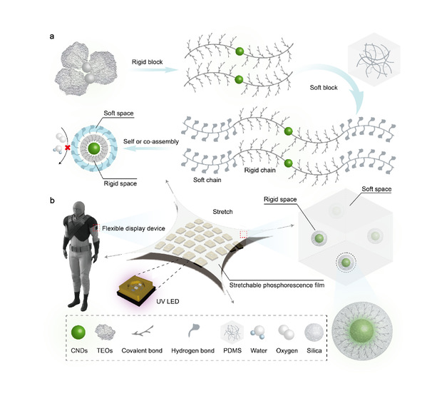 梁亚川博士通过将刚性微相嵌入柔性PDMS基质中,制备了一系列多色可拉伸磷光材料。这种独特的相互作用机制增强了材料的整体柔性和可拉伸性,最大伸长率高达97%。最终,基于这种复合材料的多功能应用得到了成功展示,特别强调了柔性显示器件,它表现出优异的拉伸性和机械适应性。这项工作不仅实现了碳点基磷光薄膜刚性和柔性的巧妙结合,有效地应对了长期困扰传统材料设计的“软硬结合”的挑战,并拓宽了RTP材料在光学显示中的应用。该研究成果以题为“Phosphorescent Elastomer through Carbon Nanodots Microphase Engineering for Diverse Applications”发表于材料物理领域TOP期刊《Nano Letters》(影响因子IF=9.6)。梁亚川博士目前主持国家自然科学基金青年项目1项,河南省优秀青年基金项目1项。论文链接:https://pubs.acs.org/doi/abs/10.1021/acs.nanolett.5c01655。
