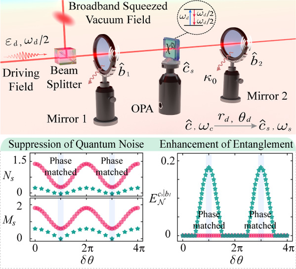 焦亚峰博士提出一种基于压缩腔光力系统实现宏观机械振子量子纠缠态制备和相干增强的理论方案。在现有光机械弱耦合机制的实验条件下,通过协同利用由光学参数放大器(OPA)产生的腔内压缩和腔外注入的宽频压缩真空场,不仅能够极大地增强腔光力系统的光机械耦合强度,还可以有效抑制OPA引发的环境加热效应,进而实现了多组分机械振子纠缠态在相干性和鲁棒性方面的显著提升。该研究成果以题为“Tripartite Quantum Entanglement with Squeezed Optomechanics”发表于应用物理领域TOP期刊《Laser & Photonics Review》(中科院一区,影响因子IF=9.8)。焦亚峰博士目前主持国家自然科学基金青年项目1项,河南省优秀青年基金项目1项。论文链接:https://onlinelibrary.wiley.com/doi/abs/10.1002/lpor.202301154。
