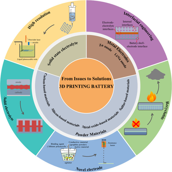 3D打印作为一种先进的增材制造技术在电池制备方面显示出广阔前景。由于其高设计灵活性、低成本和较少的废物产生,3D打印已被成功应用于制造各类电池组件,如阴极和阳极材料、固态电解质和电池外壳等。研究表明,周期性的三维通道和骨架可有效改善电极中离子/电子传输,从而有利于面载量和电化学性能的提高。然而,3D打印在解决不同电池体系及全打印电池中的关键科学问题仍然存在挑战。本文重点介绍了3D打印如何为粉末电极、金属电极及固态电解质提供解决方案;讨论了不同3D打印技术在电池制造、后处理工艺、电池构型和包装方面的独特能力;分析了3D打印在应对电池材料制造方面的特点和挑战;旨在为推进3D打印电池的发展提供见解,为3D打印成为未来制造业的重要组成部分奠定基础。