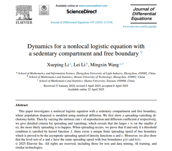 近日,数学与信息科学学院李雪平博士在数学领域国际知名学术期刊《Journal of Differential Equations》(中科院一区TOP)上发表题为 “Dynamics for a nonlocal logistic equation with a sedentary compartment and free boundary(具有定居种群组分和自由边界的非局部logistic方程的动力学行为)”的研究论文。该成果以开云APP官网下载和官网链接 为第一署名单位,李雪平博士为第一作者,与河南工业大学李磊博士、山西大学王明新教授共同合作完成。